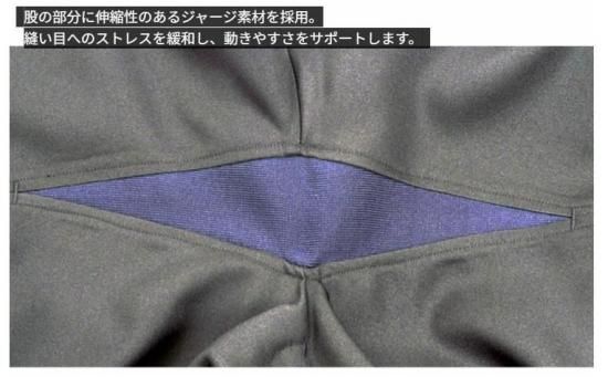 快適な着用感: 股部分には伸縮性のあるジャージ素材を使用しており、動きやすさをサポートします。縫い目へのストレスを軽減し、長時間の着用でも快適です。